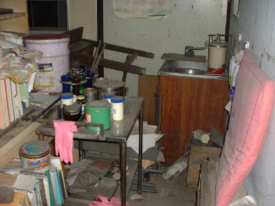 もちろん窓は土砂で埋まってますから真っ暗です。フラッシュの光で一瞬だけ部屋の全容が見渡せます。 |